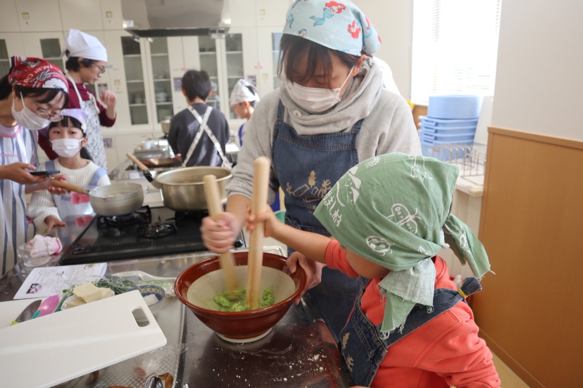 雑煮に入れる野菜を細かく切ったり、枝豆の薄皮をとったりする工程は手間がつきもの。それを親子で一緒に、そして他の親子やボランティアさんも加わって取り組むと、お話ししながら楽しく進めることができます。