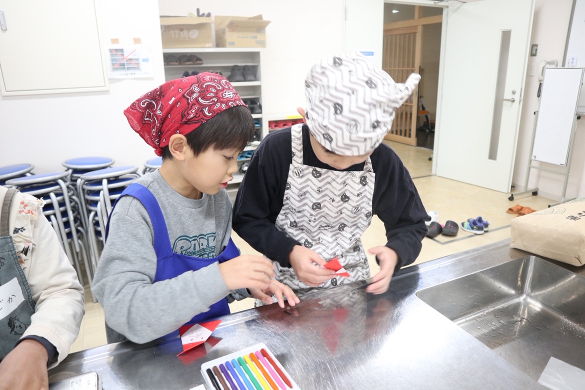 箸やスプーンなどを入れることができる、サンタの折り紙を紹介しました。折ったり顔を描いたりしながら、クリスマスの単語を英語で学びました。